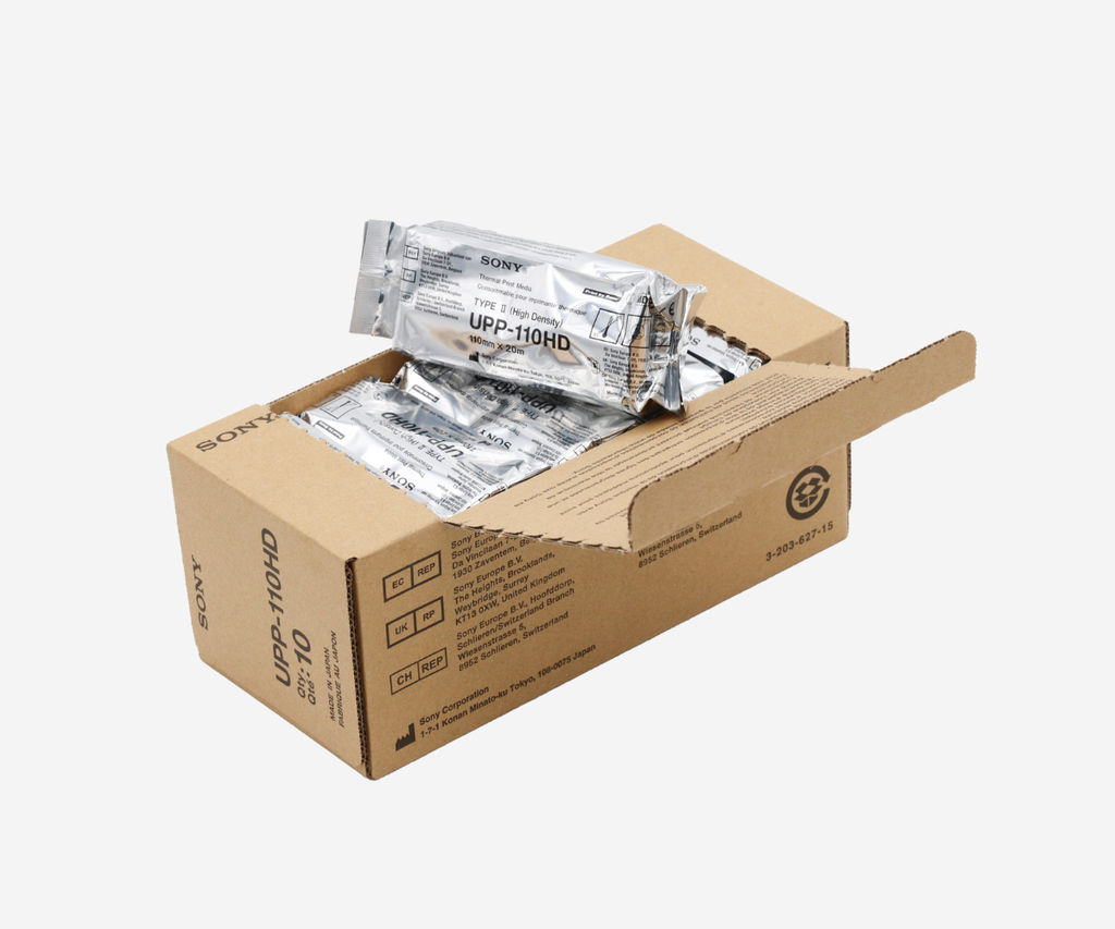 Sony UPP-110HD is a high-density black-and-white ultrasound thermal print media engineered for Sony medical video printers. Each roll measures 110 mm × 18 m (A6, 4.1 × 5.8 in) and yields approximately 270 prints; a single box contains 10 rolls. Chosen for its crisp grayscale and higher contrast, UPP-110HD helps produce sharp diagnostic images on compatible Sony printers.